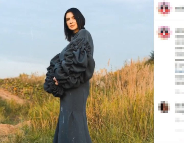 В инстаграме Стриженова выложила снимок в вечернем платье с объемными рукавами-воланами. Стоя вполоборота, она сложила руки на животе, из-за чего объемы тела в области талии визуально увеличились.