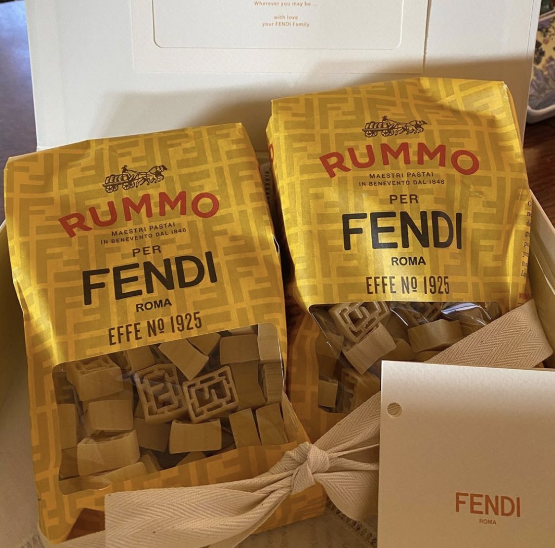 Модный дом Fendi выпустил брендированную пасту в виде логотипа компании, сдвоенной буквы F. Об этом в своем Instagram рассказал дизайнер Ким Джонс и поделился фото брендированных макарон в фирменной упаковке, которую получил каждый гость показа, пишет Корреспондент.