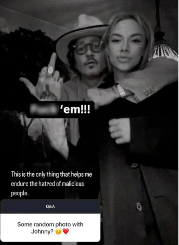 Этот снимок россиянка показала в ответ на просьбу подписчиков в Instagram показать рандомный кадр с возлюбленным. На нем Власова стоит в объятиях Деппа, а мужчина в то время демонстрирует поднятый вверх средний палец.