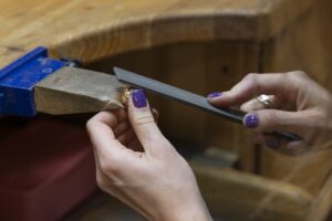– Ilmselt viilimine ja vormi väljatoomine. See on monotoonne, aga mulle meeldib – sel hetkel ese justkui „sünnib“. Kõige ebameeldivam on poleerimine. See on must töö: pasta lendab igale poole laiali, katab käed, näo ja riided. Hea nahk on meie ametis haruldus.