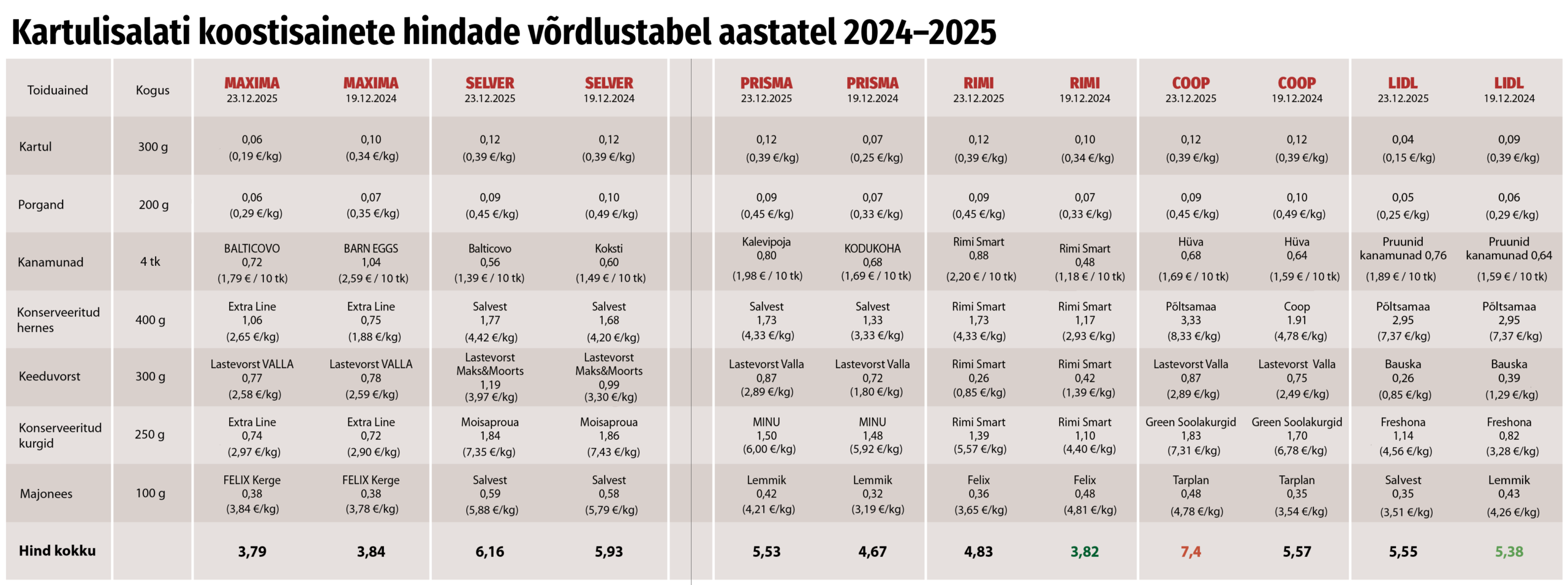 Kokkuvõtteks võib öelda, et kui osta kõik tooted ühe keti kauplusest, siis kõige odavam 2025. aasta kartulisalat (1,6 kg) tuleb Maxima klientidel: nemad saavad hakkama 3,79 euroga, mis on isegi vähem kui eelmise aasta madalaim maksumus – 3,82 eurot, mida pakkus Rimi. Kõige kallimat toidukorvi pakub sel aastal Coop – 7,40 eurot. Selver – 2024. aasta kõrgete hindade liider – on teisel kohal 6,16 euroga kausitäie salati eest.