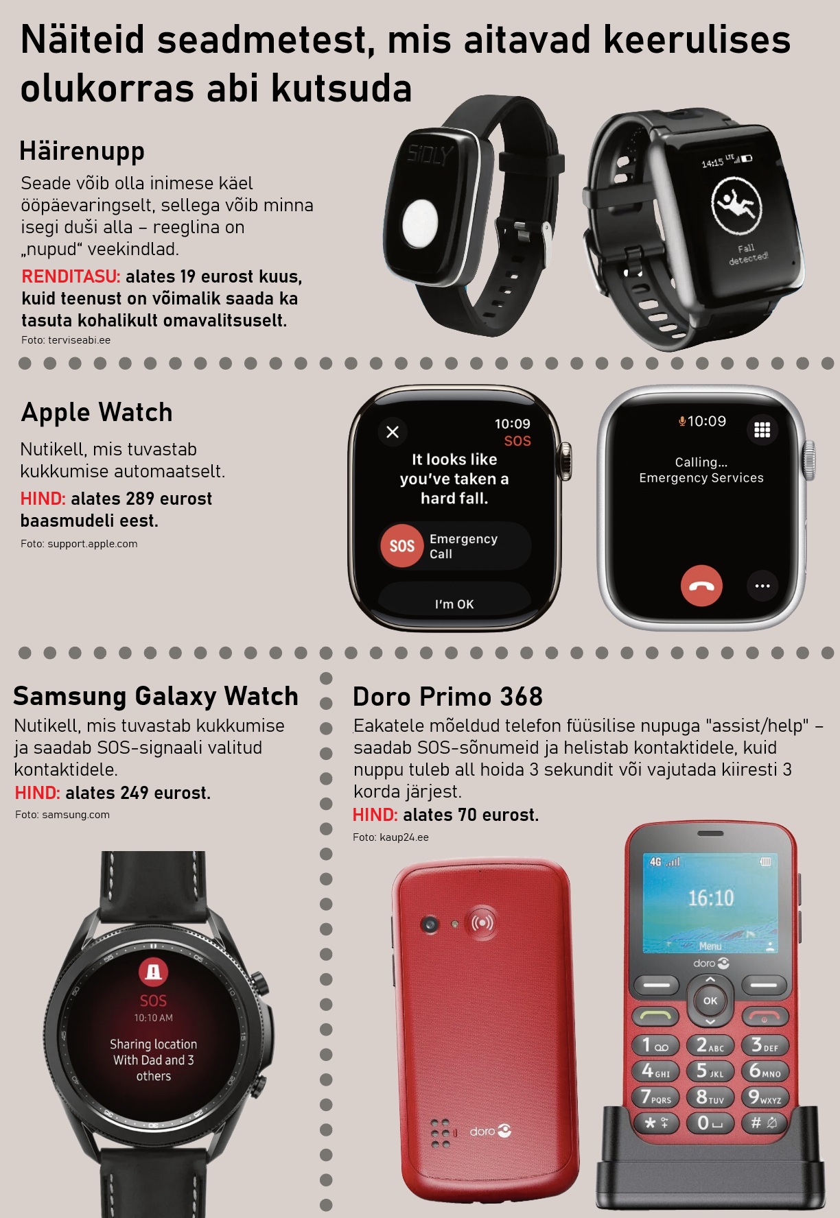 „Minu ema elab Ida-Virumaal, mina aga Tallinnas,“ räägib Jevgeni (48). „Kinkisin talle hiljuti kukkumisanduriga nutikella. Teatud olukordades ilmub ekraanile teavitus ja kell küsib – tundub, et olete kukkunud, kui teiega on kõik korras, vajutage ekraanil olevat liugurit. Kui inimene 10–20 sekundi jooksul ei reageeri, tehakse automaatne kõne Häirekeskusesse. Nüüd, kui emal on selline vidin, muretsen ma vähem.“