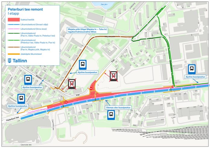 Ehitustööde ajal kehtib liikluses 2+1 süsteem: kaks rada linnast välja, üks rada kesklinna poole. Tööde käigus säilib ka ühistranspordi liiklus, kuid liinide töö võib olla ümber korraldatud. Tööd on kavandatud nõnda, et sel sügisel algavad tööd lõigul Majaka – Väike-Paala kesklinna suunal; järgmisel aastal algavad ehitustööd lõigul T1 kaubanduskeskus kuni Majaka trammipeatus Lasnamäe suunal. Peterburi teel asuvate bussi ootepaviljonide asukohti muudetakse ajutiselt. Autoomanikud ning ühistranspordi kasutajad peaksid arvestama, et tööde algfaasis võib sõiduaeg pikeneda mitme minuti võrra, eriti tipptunnil.