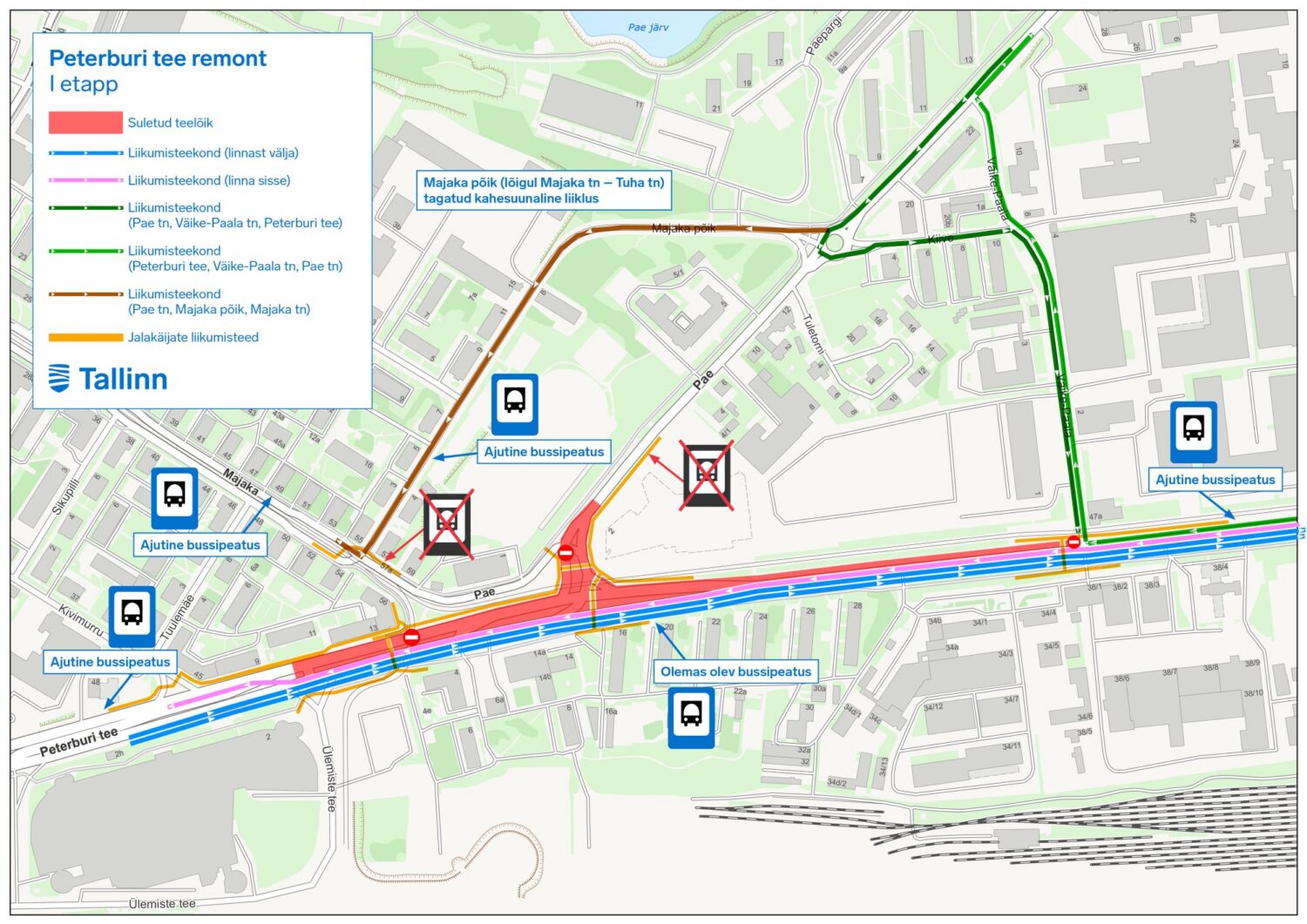 Tööde ajal säilib ühistranspordi, sealhulgas ka trammide liiklus, kuid ehitustööde tõttu muudetakse alates neljapäevast kuni järgmise aasta 18. novembrini bussiliinide number 7, 12, 50, 55 ja 58 liikumisteid ning bussiliini number 54 peatuste asukohti Peterburi teel. “Pae” peatus Lasnamäe suunal ajutiselt suletakse. Täpsed sõiduplaanid, liinide liikumisteed ja peatused on leitavad veebilehel transport.tallinn.ee.