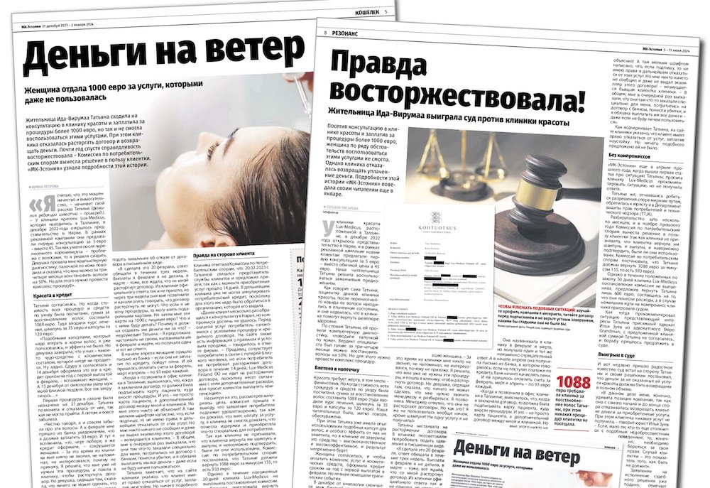 В 2024 году «МК-Эстония» дважды писала о том, как жительница Нарвы Татьяна Мушенко пыталась вернуть деньги, уплаченные ею клинике красоты Lux Medicus за процедуры, которых она так и не получила. Как стало известно весной прошлого года, суд встал на сторону Татьяны и вынес решение – деньги вернуть. Однако хеппи-энда не случилось – фирма сделала финт ушами и воспользовалась распространенной в Эстонии схемой. «МК-Эстония» выяснила, чем закончилась нашумевшая история.