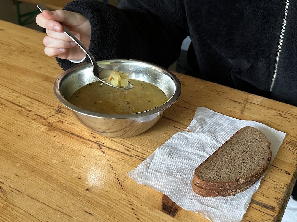 Кухня сама по себе небольшая – четыре стола по 6 мест. На раздаче еды стоят двое мужчин. Без лишних вопросов один из них предлагает мне сесть и приносит тарелку супа. Порция довольно большая – алюминиевая тарелка вмещает около 400 мл супа. Суп похож на гороховый – с довольно большими кусочками курицы, картошкой и перловкой. Он горячий и вполне вкусный. На столах также стоят тарелочки с двумя видами хлеба. За напитком надо подойти отдельно. Можно выбрать чай или морс.