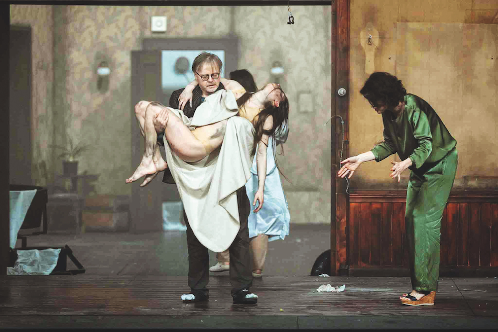 Будет метаться, задыхаться и умолять о помощи главная героиня, чеховская Ольга – Саманта Пинайтите (кстати, всех персонажей крымовского спектакля зовут именами литовских актеров, которые их играют). А прекрасная Тома Гайлиуте – Маша – будет невозмутимо наблюдать за разгорающимся в квартире пожаром. Ближе к развязке на сцене появится очаровательная Сигуте Гаудушите – Наташа, и первым делом она расскажет всем о преимуществах арбузной диеты. Между тем растерянный Дариус Мешкаускас – Чебутыкин на руках вынесет с пепелища чудом уцелевшую Саманту.