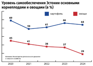 – В 2020–2024 годах уровень самообеспеченности картофелем оставался относительно стабильным, с небольшими колебаниями между 59% и 69%. При этом уровень самообеспеченности овощами постоянно снижался, сократившись с 45% до 29%. Резкое снижение самообеспеченности в 2024 году отражает падение урожая из-за неблагоприятных погодных условий.