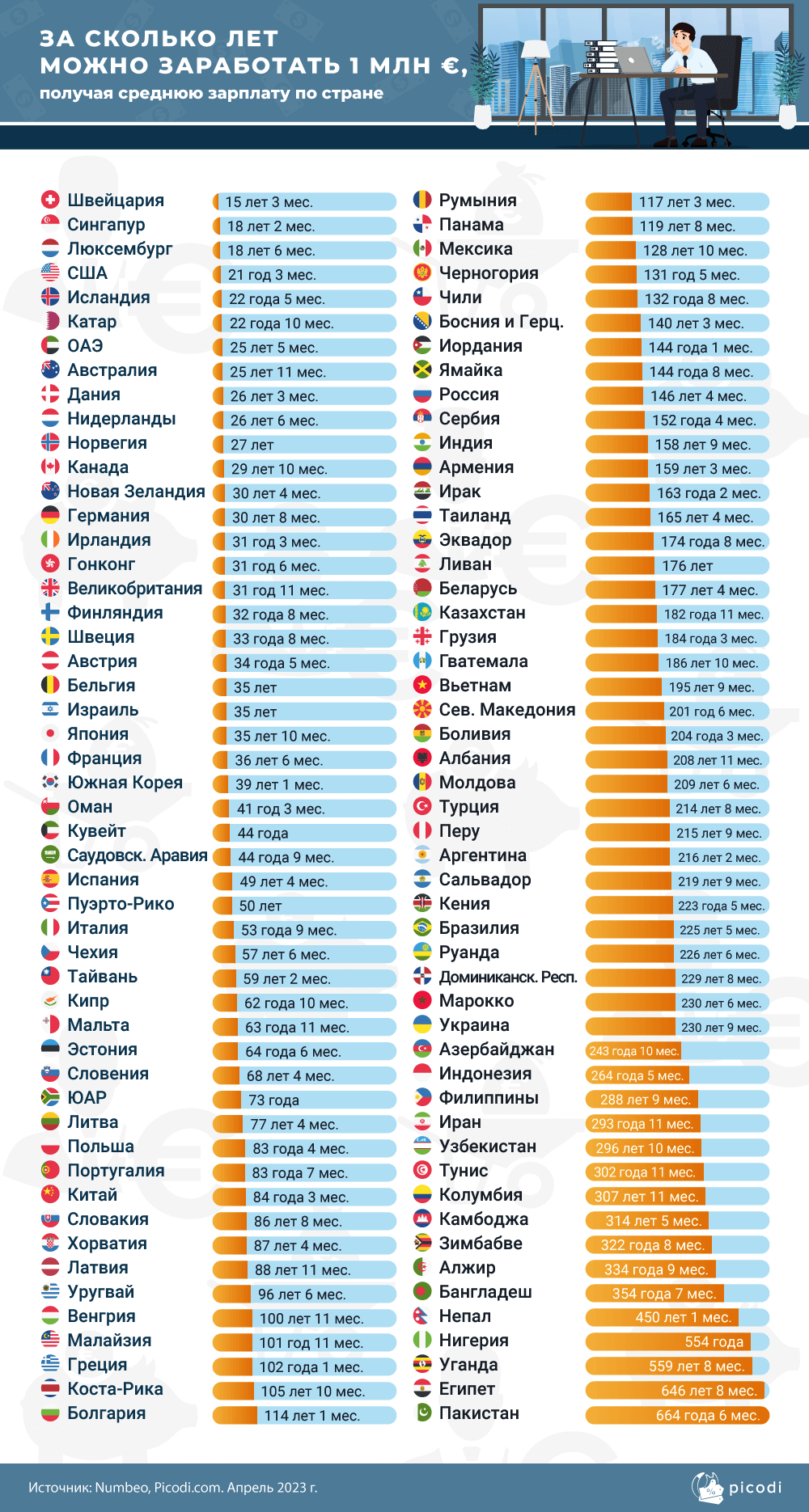 Работая десятки лет, люди зачастую не задумываются, сколько денег они заработали в совокупности. Аналитики Picodi.com посчитали, за сколько лет жители разных стран могут заработать миллион евро, получая среднемесячную заработную плату по стране.