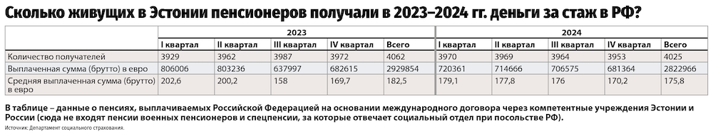 «Речь в данном случае идет о российских военных пенсионерах и их вдовах, которым пенсии выплачивают в социальном отделе при посольстве Российской Федерации, а не через Департамент социального страхования, – разъясняет представитель ведомства Ксения Репсон-Дефорж. – Что касается остальных пенсионеров, получающих пенсию или часть пенсии от РФ, то Департамент социального страхования ведет плановую работу. На данный момент мы ожидаем, что, согласно действующему договору, мы к 20 февраля получим списки этих пенсионеров. После этого начнем обрабатывать их, и выплаты должны состояться в марте. Как обычно, пенсии перечисляют раз в квартал».