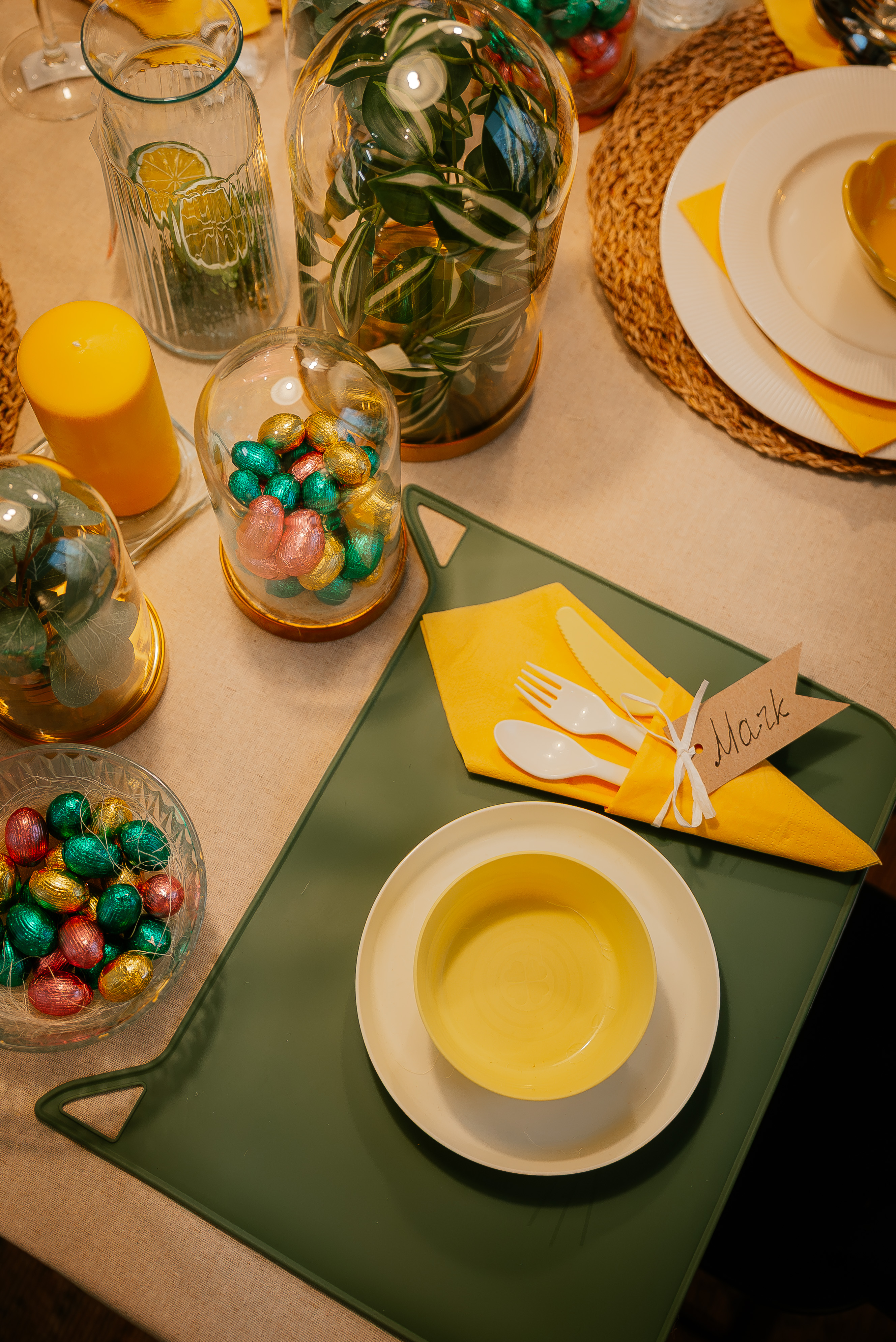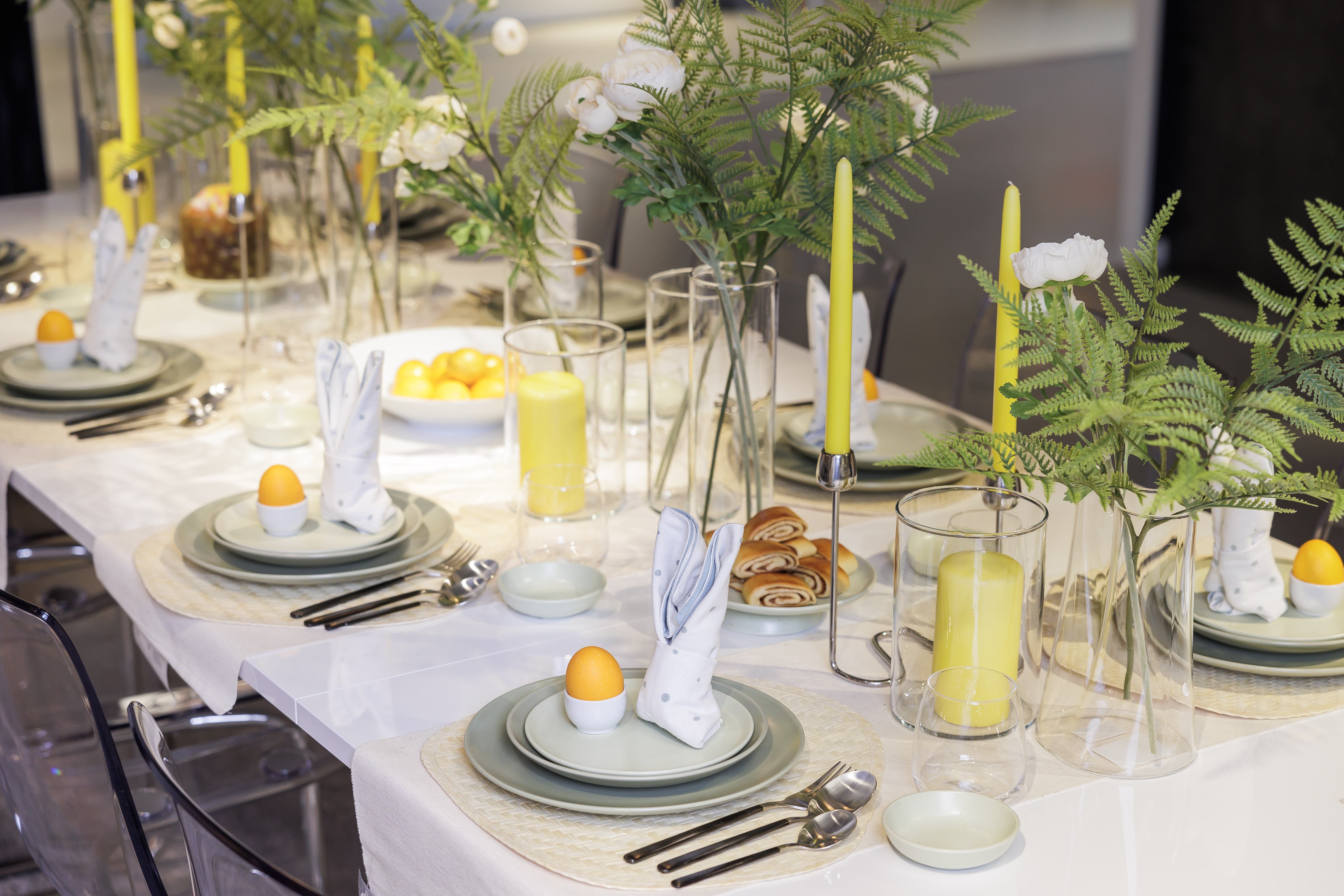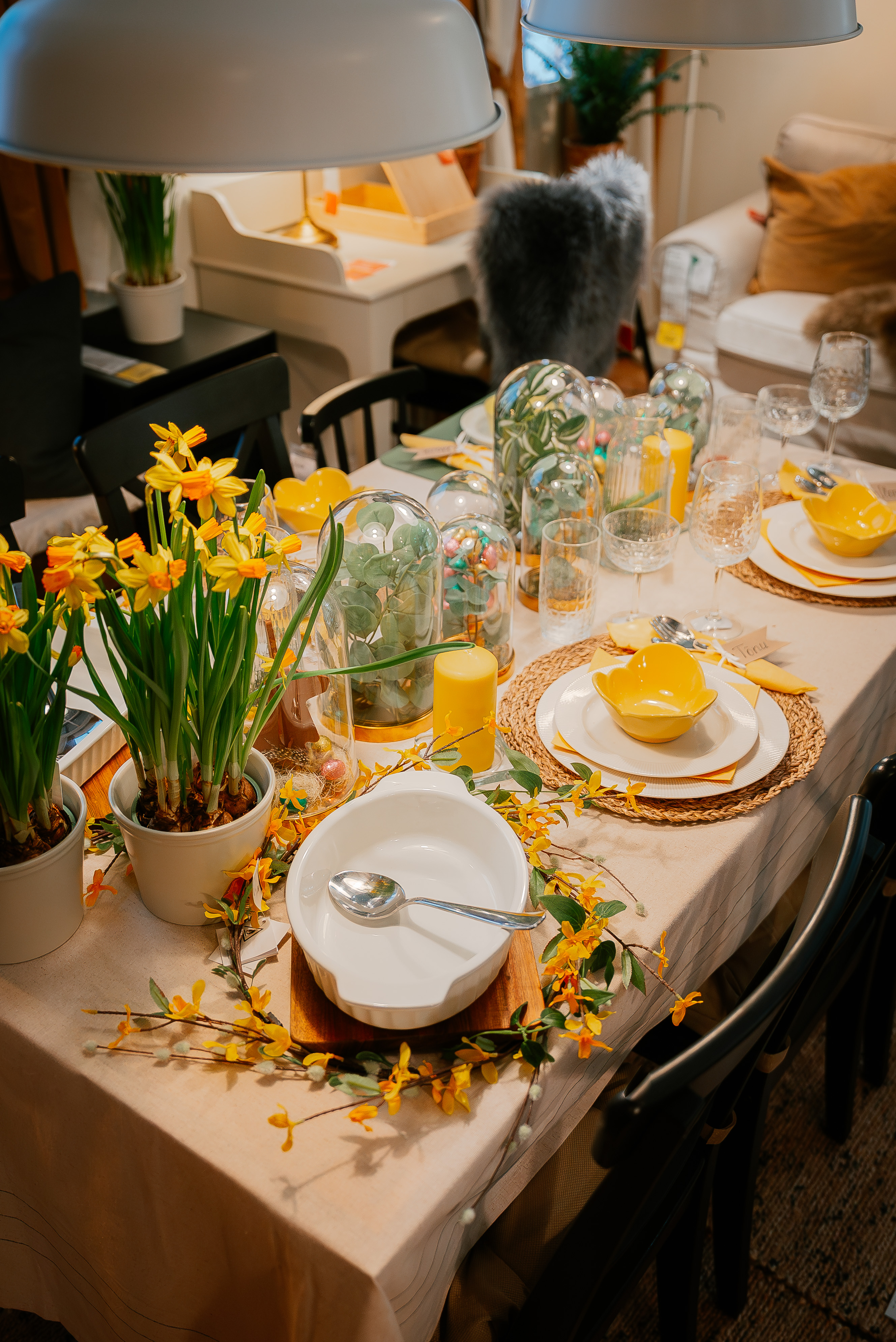 «Украсьте середину стола, разместив ряд стеклянных клошей или разноцветных пиал разного размера. Выбранную посуду можно наполнить мхом, или искусственными цветами, уже окрашенными яйцами или даже угощениями, например, шоколадными яйцами или фигурками зайцев. Вместо стеклянных клошей и пиал можно использовать желтую вазу, которая объединит цветовую гамму. Чтобы добавить композиции объема, по краям стола можно разместить горшки с нарциссами или графины с водой, создавая игру высоты и пространства».