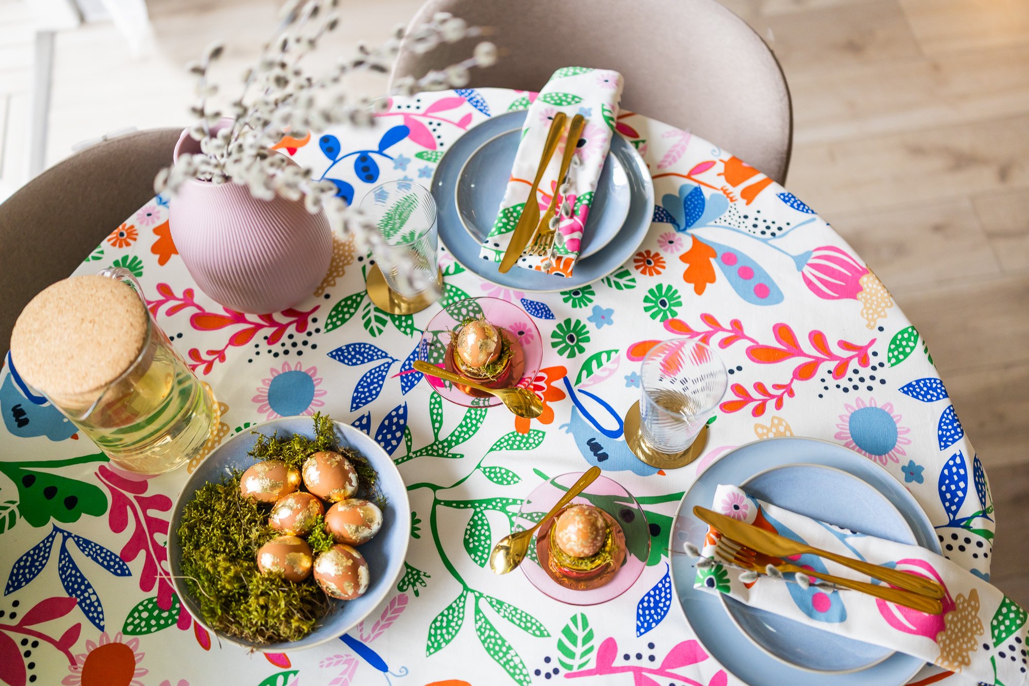 Если оформление интерьера — не ваша сильная сторона, дизайнеры советуют упростить задачу: выбрать яркую скатерть с узором. Дополните её подходящими многоразовыми салфетками и имеющейся посудой — и ваш праздничный стол произведет впечатление на гостей.