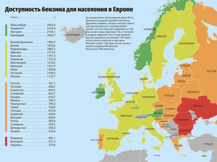 Другими словами: сколько литров самого распространенного топлива может купить тот, кто получает среднюю по той или иной стране зарплату. Так, в Эстонии в первом квартале этого года средняя брутто-зарплата составляла 1341 евро – после вычета налогов и при цене бензина около 1,30 евро на нее можно купить порядка 848 литров.