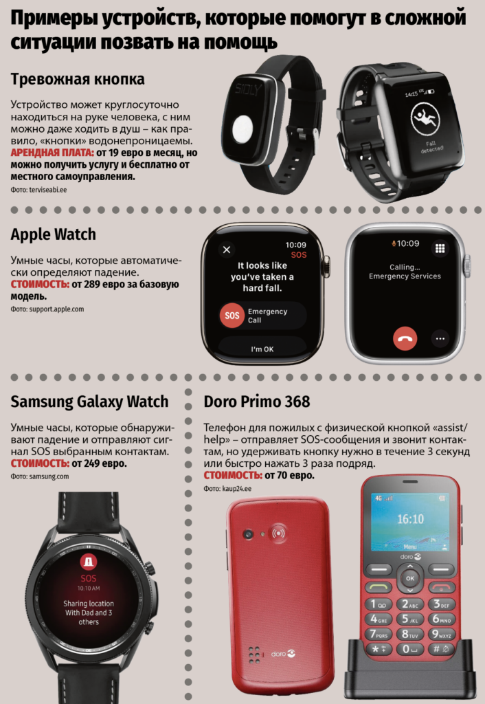 «Моя мама живет в Ида-Вирумаа, а я – в Таллинне, – рассказывает Евгений (48). – Недавно я подарил ей умные часы с датчиком падения. В определенных обстоятельствах на экране появляется уведомление, часы спрашивают – мол, кажется, вы упали, если с вами все в порядке, то нажмите на ползунок на экране. Если человек 10–20 секунд не реагирует, то идет автоматический вызов в Центр тревоги. Теперь, когда у мамы есть такой гаджет, я меньше переживаю».