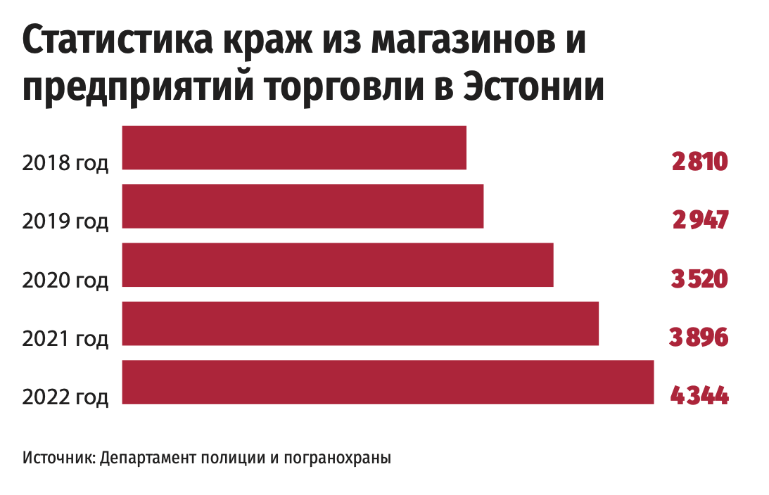 Воруют не только в ЭстонииВ соседних с Эстонией странах также обеспокоены ростом краж из магазинов. В Латвии это связывают с отменой коронавирусных ограничений. Bb.lv пишет, что в 2019 году было зарегистрировано 10 594 кражи, 2020 году – примерно столько же, а в 2021 – менее 6000. А в 2022 году было зафиксировано на 1508, или на 23,6%, краж больше, чем в 2021 году. Воруют, в основном, кофе, алкоголь, икру, твердый сыр, а также средства для красоты и гигиены. Как сообщает yle.fi, ежегодно в Хельсинки регистрируют около 10 000 магазинных краж. Чуть менее 200 из них так или иначе связаны с сыром. Так, например, в магазине Lidl в восточном Хельсинки за последние годы было украдено так много сыра, что его стали хранить на складе, а желающим приобрести сыр необходимо обращаться к персоналу. В полиции рассказывают, что алкоголь – многолетний фаворит у воров. Кроме того, в статистике выделяются такие товары, как растворимый кофе, бритвенные лезвия, а в последнее время сменные насадки для электрических зубных щеток и витамины. Рекордная инфляция спровоцировала рост цен, в результате чего и в литовских магазинах участились кражи, пишет Delfi. По словам представителей торговых сетей, число краж в 2022 году увеличилось в разы, если сравнивать показатели с предыдущим годом. Они отметили, что с прилавков исчезает все, даже масло и кофе. Специалисты объясняют, что граждане приходят в супермаркеты и магазины воровать по разным мотивам: одни из-за бедности, другие же с намерением продать товар после кражи на вторичном рынке. То же самое наблюдается и в Польше: за прошлый год количество магазинных краж выросло на треть. В качестве причины эксперты называют небывалый рост цен. В российских магазинах с февраля по апрель 2022 года уровень краж вырос на 18 процентов по сравнению с аналогичным периодом прошлого года. Основным «трендом» стала кража товаров на кассах самообслуживания, говорится в документе на сайте РБК. Количество хищений такого рода возросло более чем на треть (34 процента). Кроме того, на 27 процентов увеличилось количество случаев краж продуктов вместе с корзинами. Средняя сумма украденного составила 1,5 тыс. рублей (19 евро), что на 25 процентов выше, чем годом ранее. Чаще всего с прилавков крадут кондитерские изделия (19 процентов всех краж), колбасы (16 процентов), алкоголь (14 процентов), сыры (13 процентов), кофе и какао (7 процентов). Кражи участились также в магазинах одежды, детских товаров и продукции для дома. |