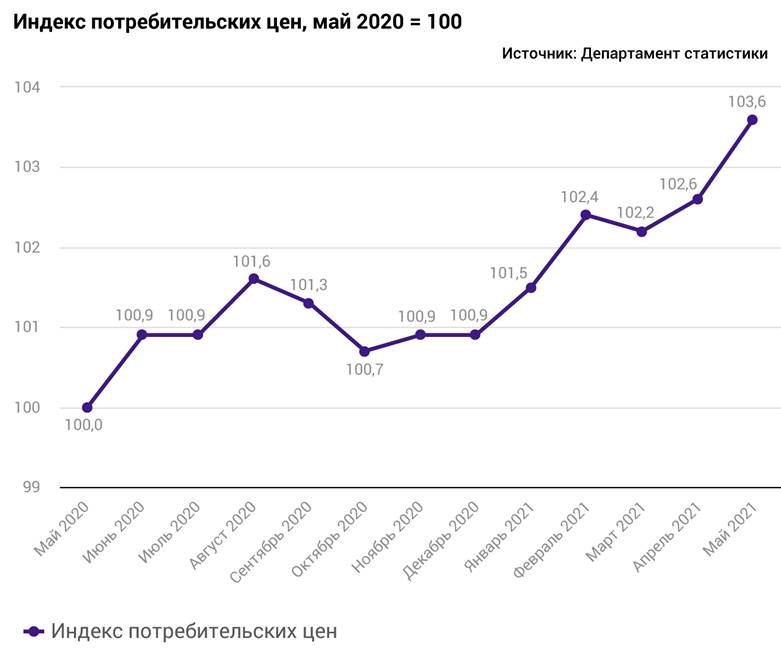 По данным Департамента статистики, индекс потребительских цен в мае повысился по сравнению с апрелем на 0,9% и по сравнению с маем прошлого года – на 3,6%. В годовом сравнении товары в мае были на 2,9% дороже и услуги – на 4,4%.