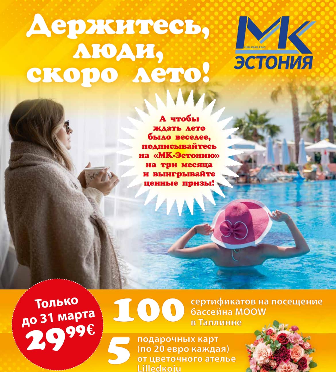 Кроме того, подписка на «МК-Эстонию» – это презент с сюрпризом. Если оформить подписку на три месяца до 31 марта, можно выиграть подарочную карту (на 20 евро) от цветочного ателье Lilledkoju или сертификат на посещение бассейна MOOW в Таллинне.