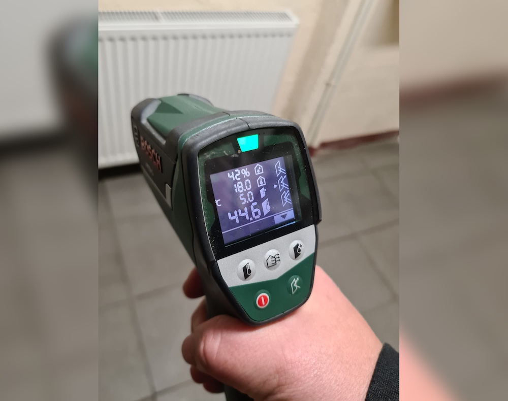 Денис проводит нас в служебное помещение и показывает датчики на трубах системы отопления: температура входящей и выходящей воды – 40 градусов (на улице в этот день было около нуля). Затем он измеряет температуру радиатора в фойе дома тепловизором: температура поверхности – 44,6 градуса Цельсия, в помещении – 18 градусов. Свищо рассказывает, что батареи Елены – тоже рабочие, они были проверены в прошлом году, и отопительная система работает корректно.