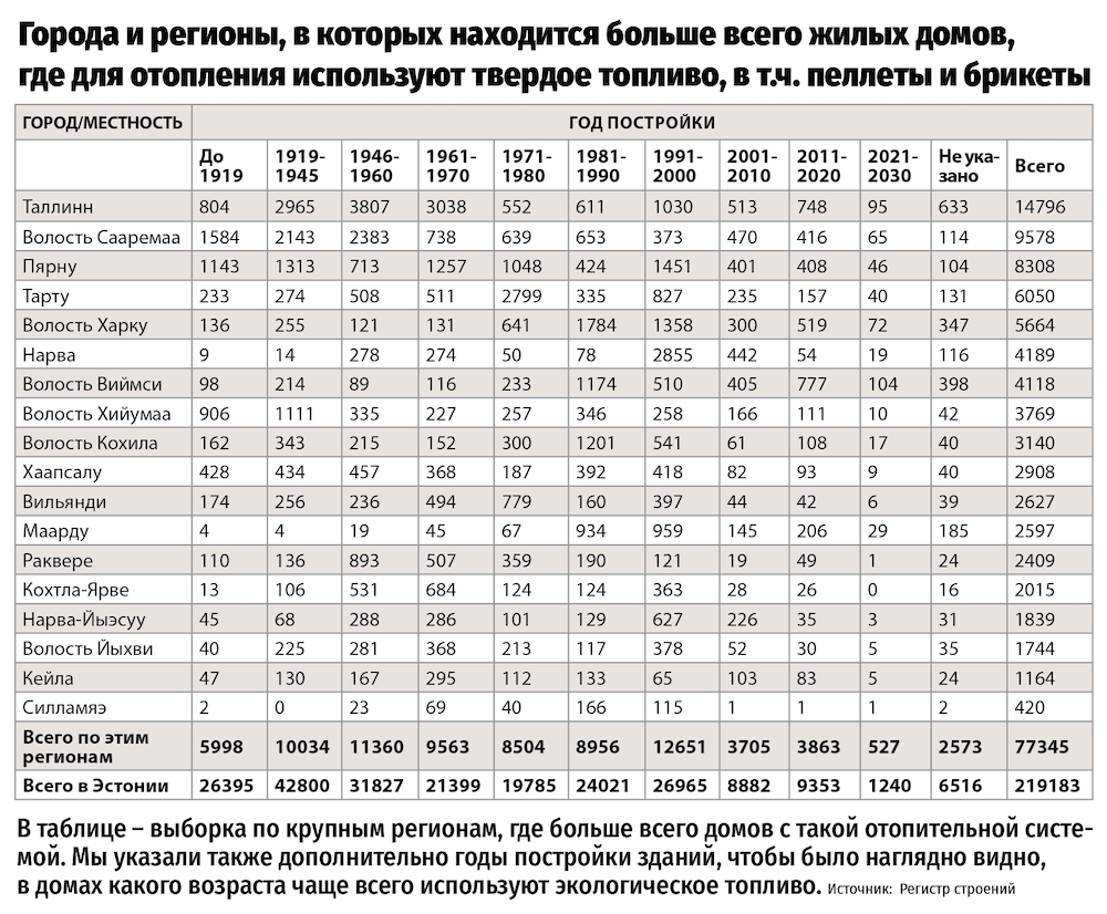 Тем не менее, по данным Регистра строений в Эстонии – 219 183 жилых строения, или 349 851 жилое помещение, которые используют для обогрева твердое топливо, в том числе древесину, торф, брикеты, древесные гранулы, опилки. Больше всего таких домов в Таллинне, на Сааремаа и в Пярну. В основном это дома послевоенной постройки 1946-1960 годов, но не только. Например, в Нарве это – дома 1991-2000 годов постройки.