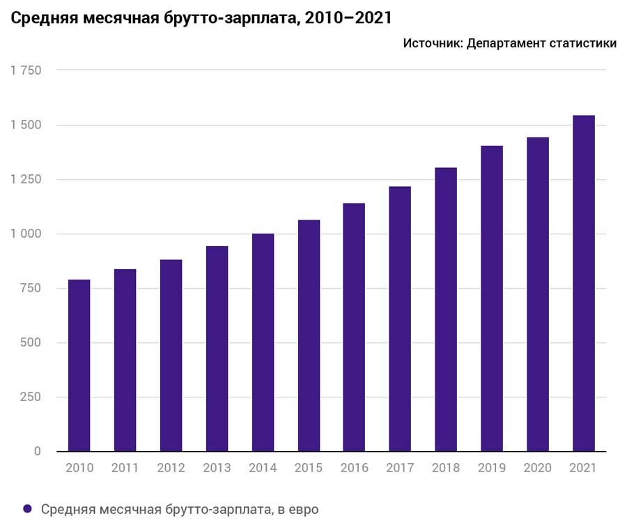 По данным Департамента статистики, в прошлом году средняя месячная брутто-зарплата на предприятиях, в учреждениях и организациях Эстонии составила 1548 евро, что на 6,9% выше, чем в 2020 году. Рост зарплат восстановился после замедления в 2020 году до уровня, предшествующего пандемии.