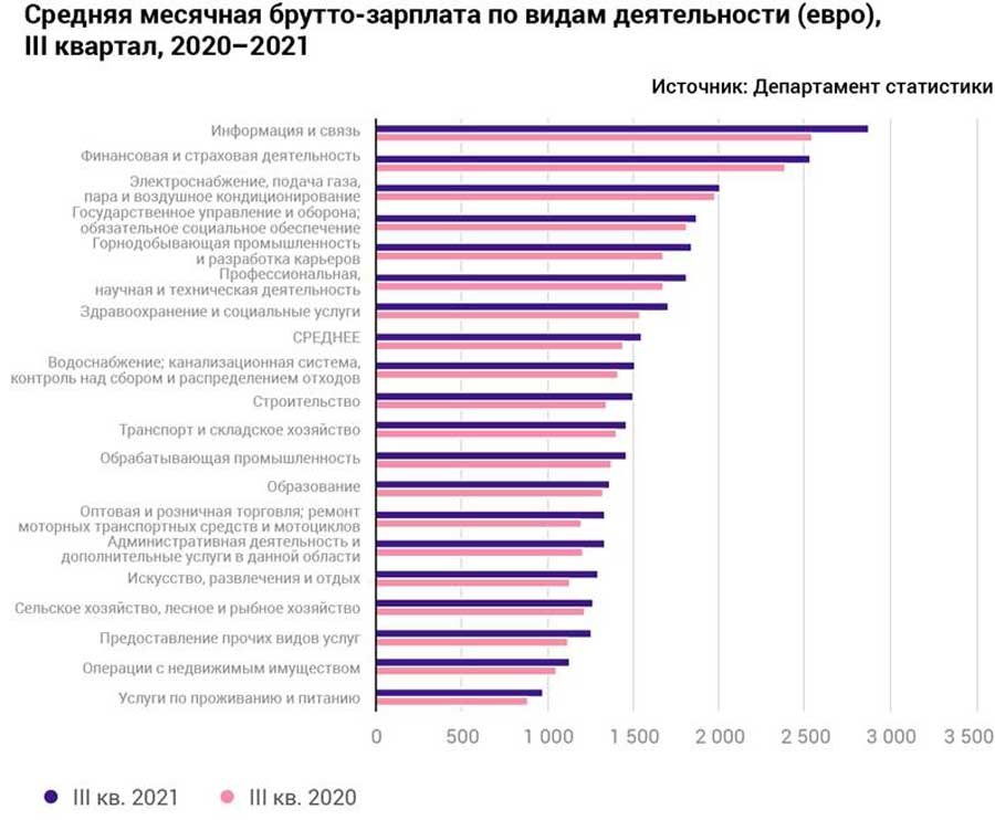 Самой высокой средняя месячная брутто-зарплата по-прежнему была в сфере информации и связи (2878 евро), финансовой и страховой деятельности (2539 евро) и в энергетике (2007 евро). Самой низкой была зарплата в сфере услуг по проживанию и питанию (976 евро), в сфере операций с недвижимостью (1133 евро) и в сфере предоставления прочих видов услуг (1260 евро).
