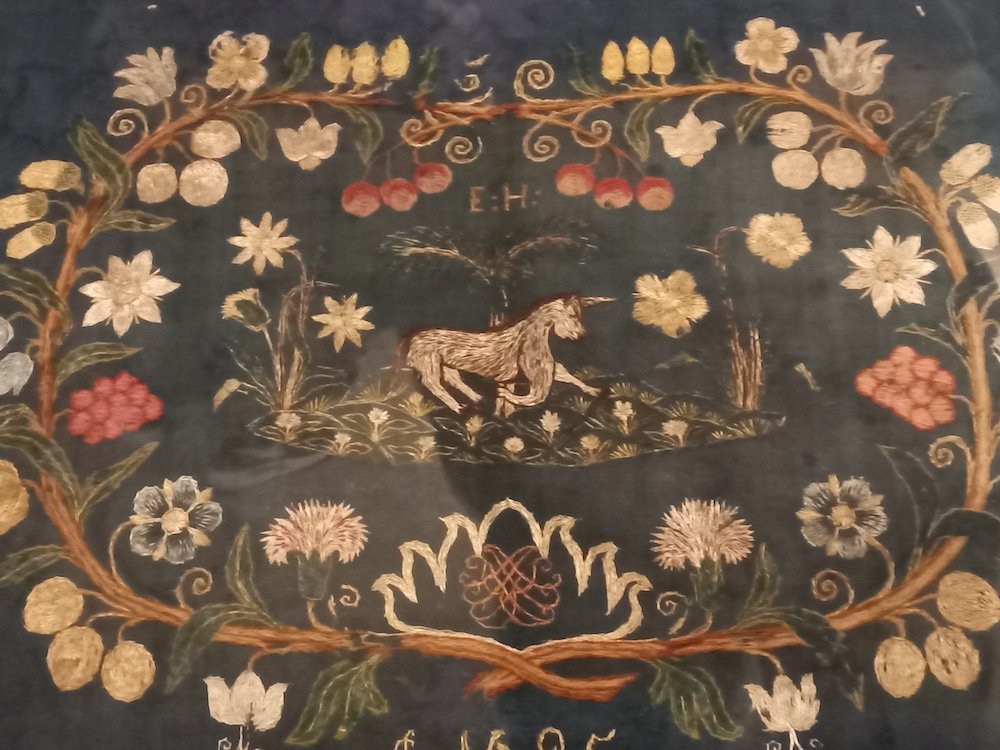 Шведская королевская коллекция богата изображениями единорогов, нанесенными на доспехи и конское снаряжение. На выставке также представлен удивительный предмет: украшение, превращающее лошадь в единорога. Декоративное дополнение шанфрона – части конской брони, защищающей голову лошади – выглядит как элемент парадного доспеха, подчеркивающий благородство и статус всадника.