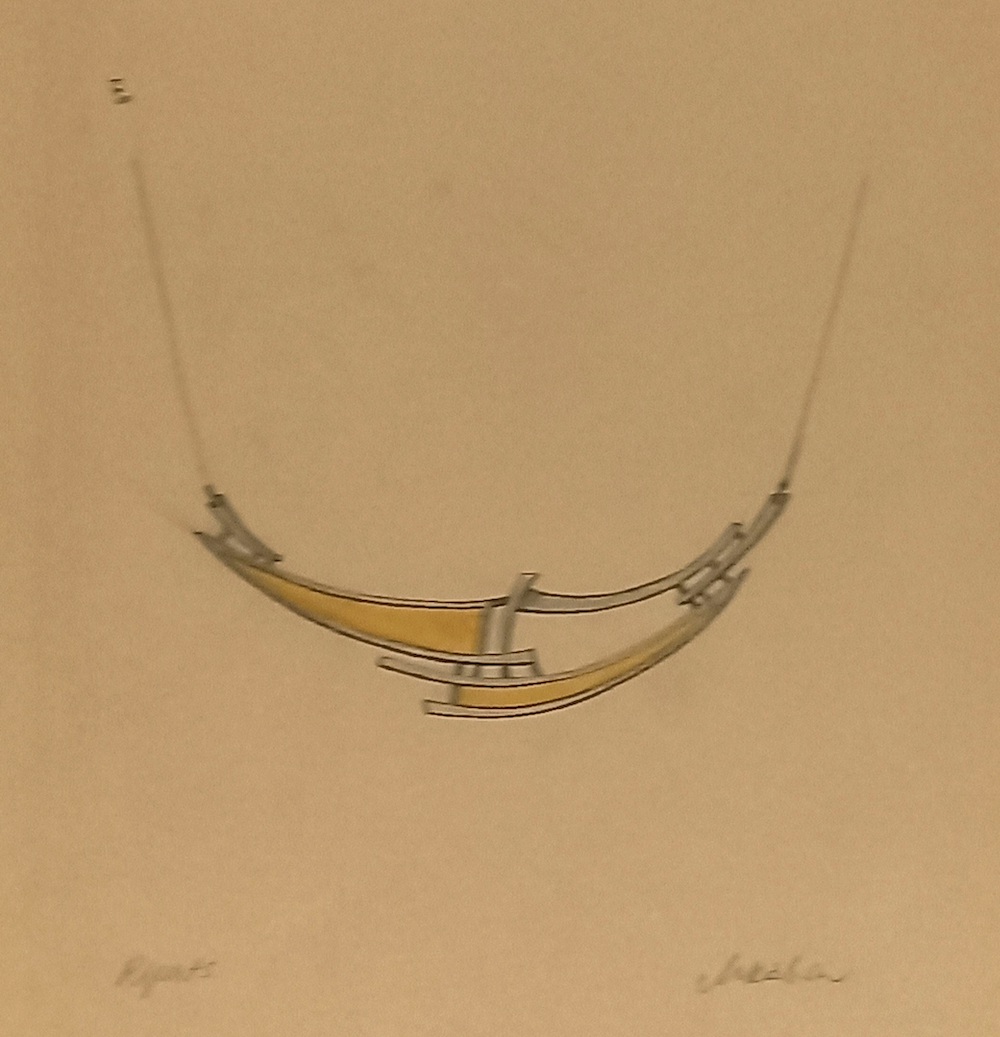 Мари Кябин, эскиз кулона. 1988: представленные рядом серьги и броши из той же коллекции дают возможность сравнить, как выглядит украшение на бумаге и в материале. Фото: Анна Троицкая