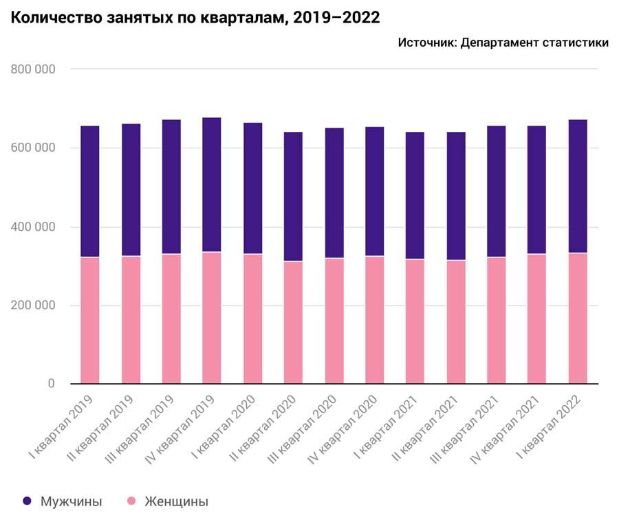 Число занятых в первом квартале этого года составило 675 300 человек, что на 24 800 человек больше, чем в прошлом году. Среди занятых 341 800 мужчин и 333 500 женщин. «Количество занятых увеличилось как среди мужчин, так и среди женщин, в государственном и частном секторах, и является самым высоким за последние годы», — добавила ведущий аналитик.