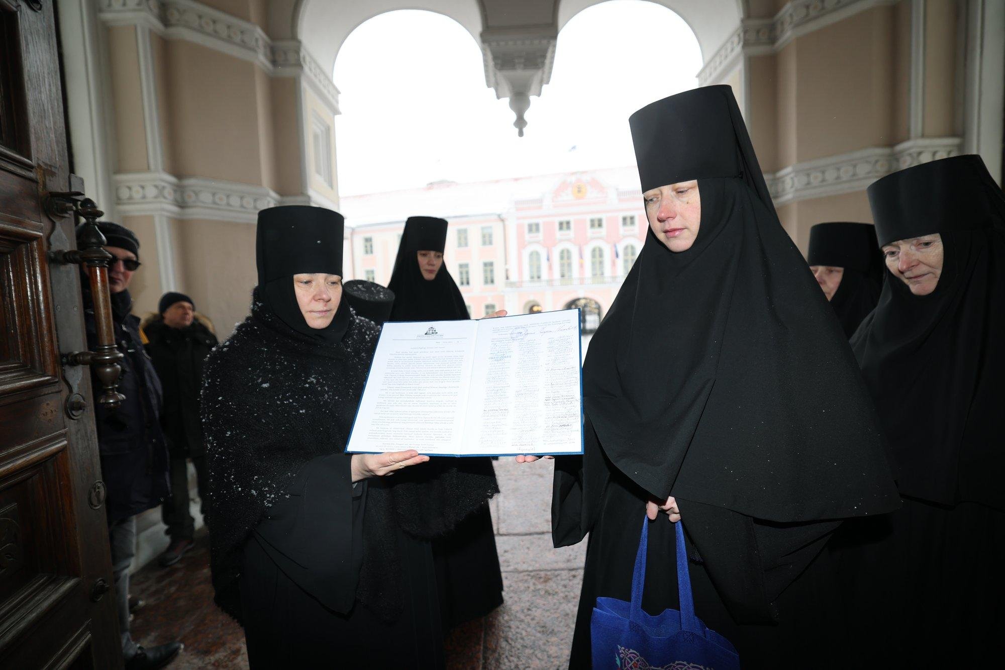 В понедельник, к зданию Рийгикогу подъехала группа монахинь Пюхтицкого монастыря во главе с настоятельницей игуменьей Филаретой. Они прибыли на Тоомпеа с прошением о сохранении прежнего статуса монастыря и ожидали встречи со спикером парламента Лаури Хуссаром («Ээсти 200»), пишет Rus.Postimees.