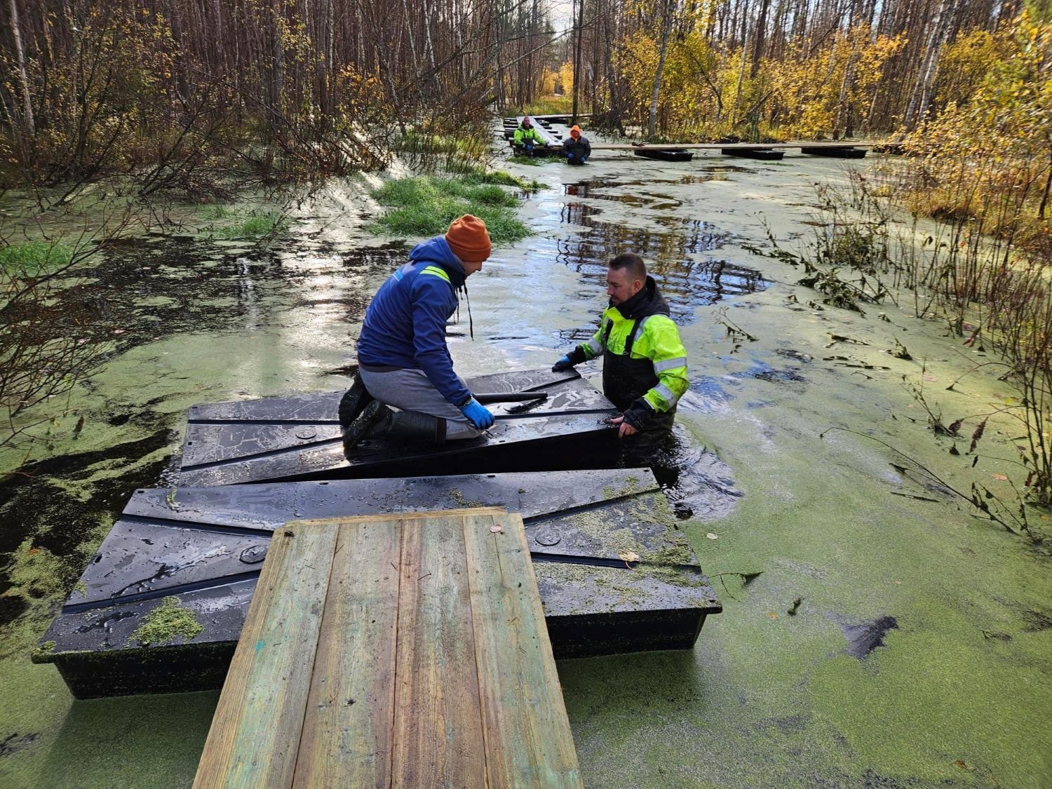 Поскольку уровень воды болота Пяэскюла высок, и тропы там в течение нескольких месяцев частично непроходимы, паевое товарищество Megal строит на болоте дощатый настил на поплавках, сообщает BNS.