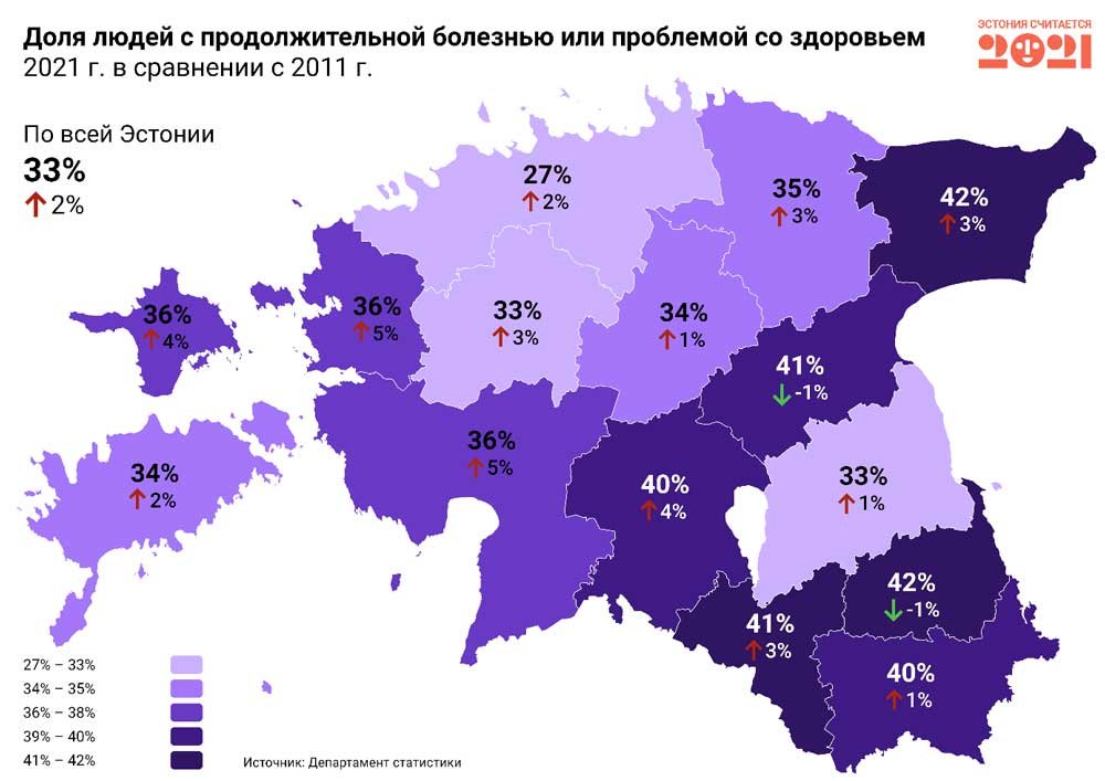 Наибольшая доля людей, имеющих продолжительные проблемы со здоровьем, наблюдается в Пылваском и Ида-Вируском уездах, где их по 42%, что почти на 9 п. п. больше среднего показателя по Эстонии (33%). Эти же показатели были на том же уровне и во время прошлой переписи (в Пылвамаа — 43%, в Ида-Вирумаа — 39%).