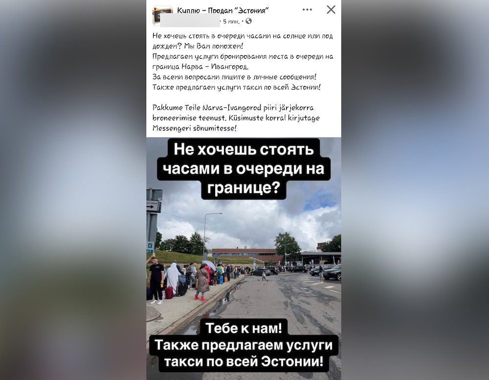 В редакцию «МК-Эстонии» обратился читатель, который прислал увиденное в социальной сети Фейсбук объявление. Там говорилось: «Не хочешь стоять в очереди часами на солнце или под дождем? Мы вам поможем! Предлагаем услуги бронирования места в очереди на границе Нарва-Ивангород. За всеми вопросами пишите в личные сообщения!»