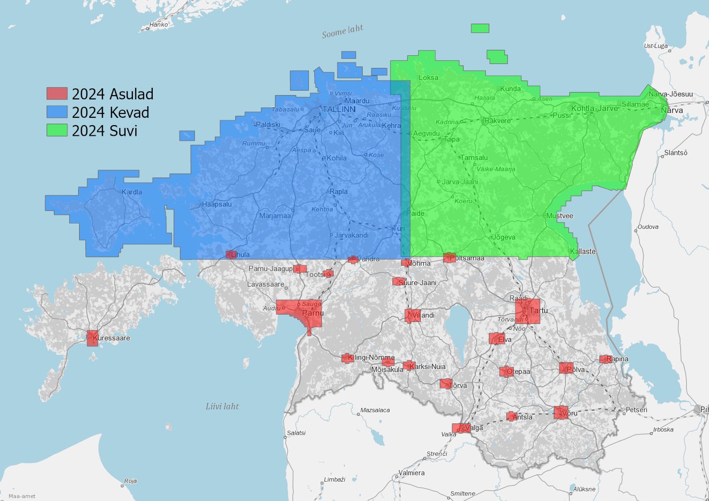 Помимо Таллинна, Тарту и Пярну, показанные на схеме небольшие города и поселки в южной части Эстонии также будут фотографироваться и лазерным сканированием ранней весной, при подходящих погодных условиях для получения более качественных 3D-данных о зданиях. Ортофото густонаселенных мест изготавливаются с размером пикселя 10 сантиметров.