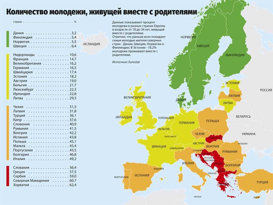 Отметим, что раньше всех покидают семьи молодые жители Северных стран — Дании, Швеции, Норвегии и Финляндии. В Эстонии — 18,2% молодежи проживают вместе с родителями.