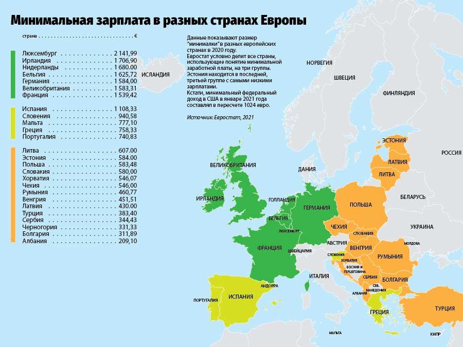 Евростат условно делит все страны, использующие понятие минимальной заработной платы, на три группы. Эстония находится в последней, третьей группе с самыми низкими зарплатами.