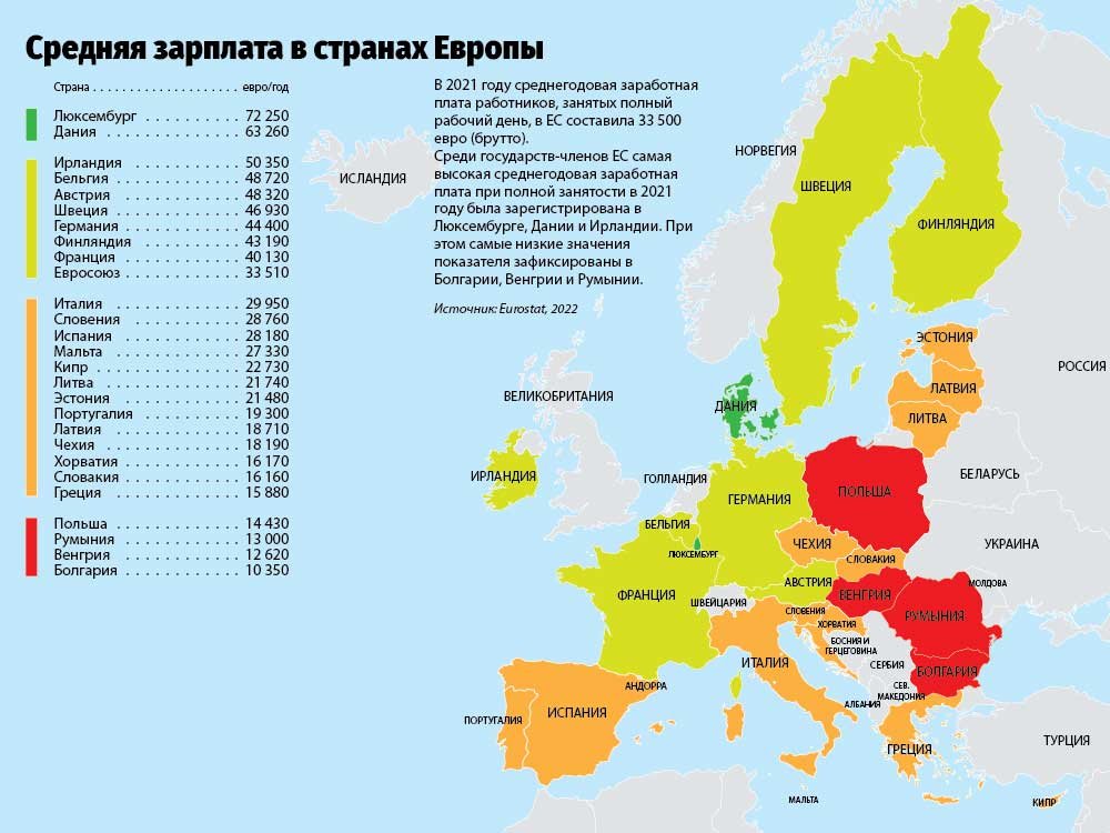 Среди государств-членов ЕС самая высокая среднегодовая заработная плата при полной занятости в 2021 году была зарегистрирована в Люксембурге, Дании и Ирландии. При этом самые низкие значения показателя зафиксированы в Болгарии, Венгрии и Румынии.
