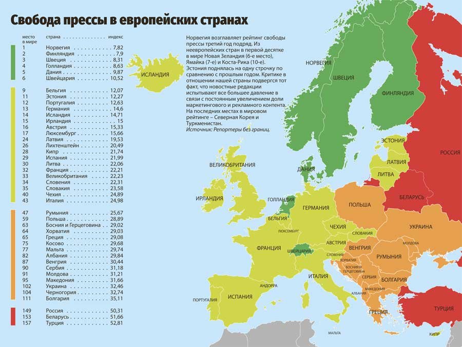 Норвегия возглавляет рейтинг свободы прессы третий год подряд. Из неевропейских стран в первой десятке в мире Новая Зеландия (6-е место), Ямайка (7-е) и Коста-Рика (10-е).