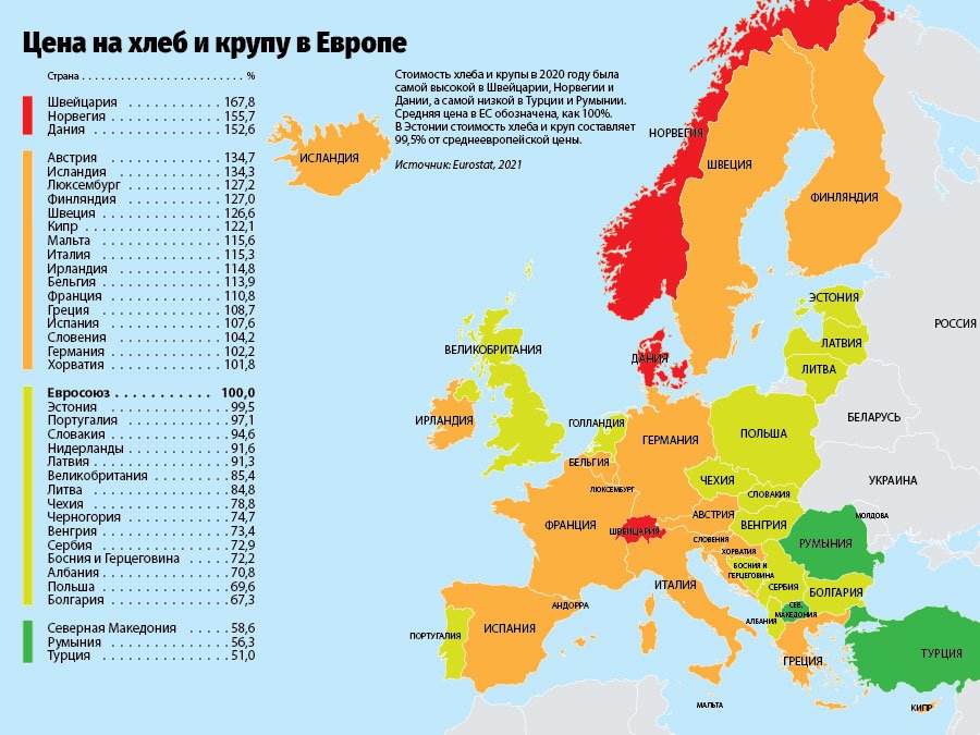 В Эстонии стоимость хлеба и круп составляет 99,5% от среднеевропейской цены.