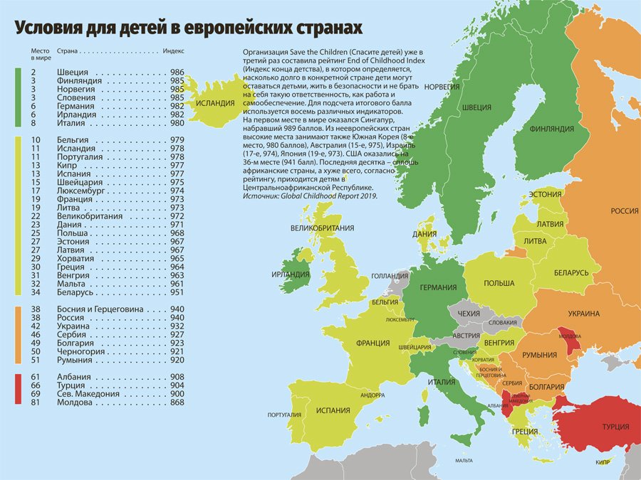 Организация Save the Children (Спасите детей) уже в третий раз составила рейтинг End of Childhood Index (Индекс конца детства), в котором определяется, насколько долго в конкретной стране дети могут оставаться детьми, жить в безопасности и не брать на себя такую ответственность, как работа и самообеспечение.