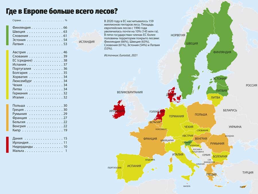 В пяти государствах-членах ЕС более половины территории покрыто лесами: Финляндия (66%), Швеция (63%), Словения (61%), Эстония (54%) и Латвия (53%).