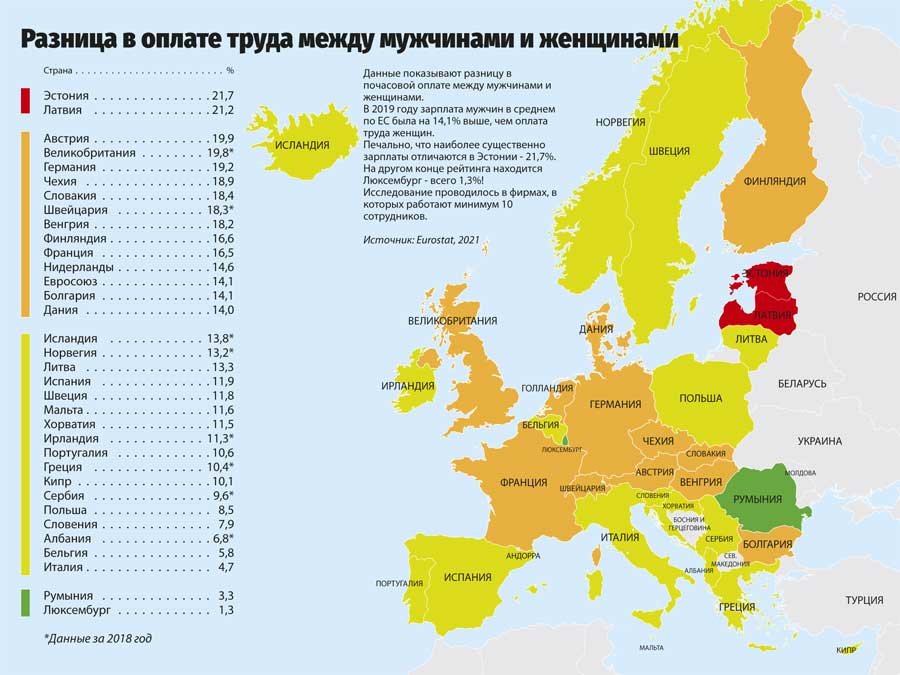 Печально, что наиболее существенно зарплаты отличаются в Эстонии — 21,7%. На другом конце рейтинга находится Люксембург — всего 1,3%!