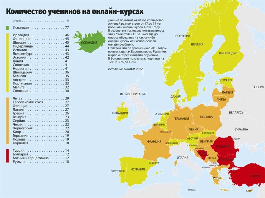 Данные показывают, какое количество жителей разных стран от 17 до 74 лет посещали онлайн-курсы в 2021 году.