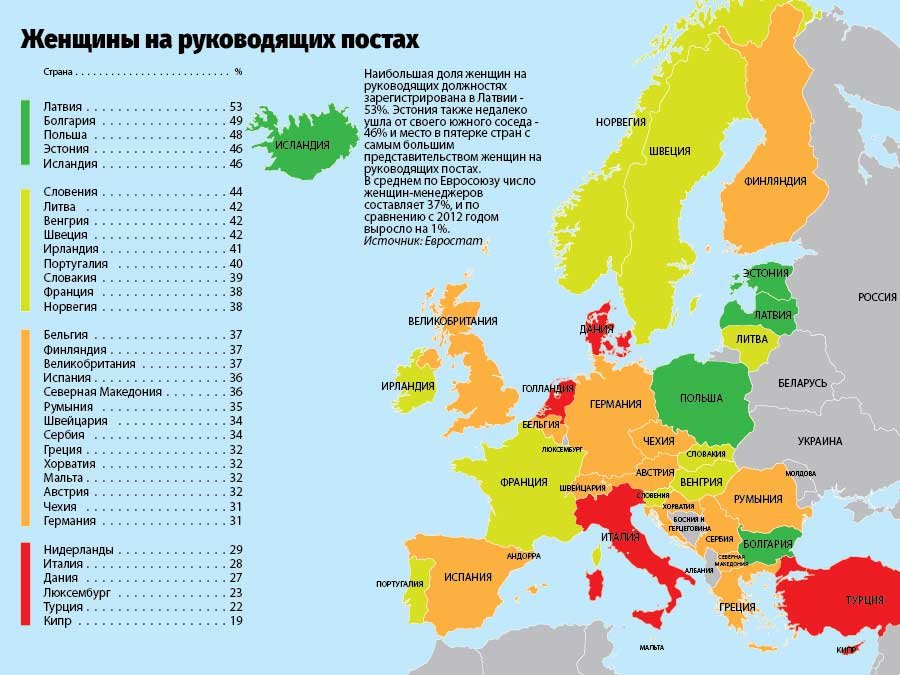 Эстония также недалеко ушла от своего южного соседа — 46% и место в пятерке стран с самым большим представительством женщин на руководящих постах.
