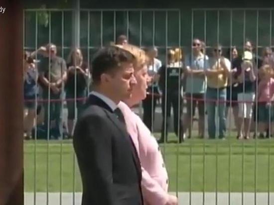 Видео, опубликованное в Сети украинском Пятом каналом, запечатлело, как Меркель пытается справится с ситуацией, ее лицо изменилось и она около десяти раз поменяла положение рук. При этом Зеленский стоял по стойке смирно и никак не реагировал на то, что происходило с немецким лидером.