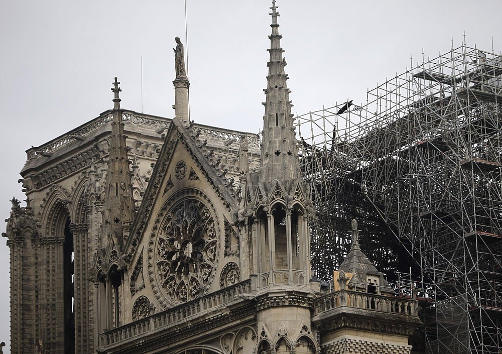 Первый из них — это пятнадцатиметровый треугольный верх фронтона в северном нефе собора. Он потерял опору после того, как сгорели крыша и деревянный каркас. Сейчас фронтон укрепили подпорками, однако угроза обрушения остается.