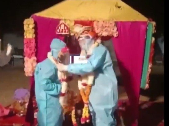 Пара из Индии связала себя узами брака в карантинном центре, надев защитные костюмы, так как у невесты обнаружился положительный результат на COVID-19.