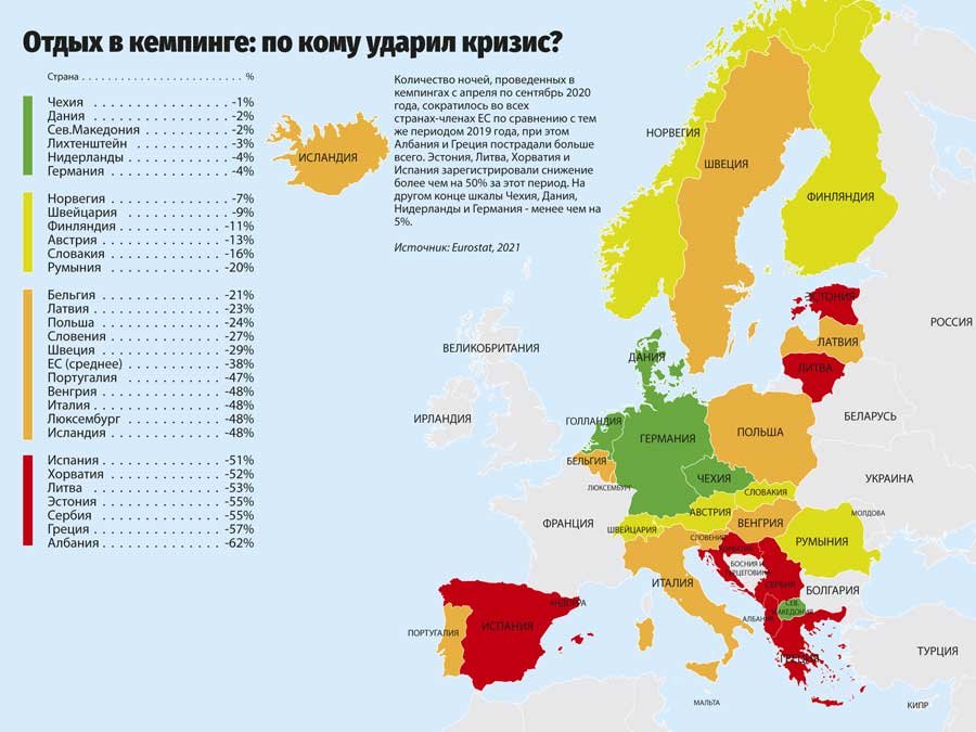 Количество ночей, проведенных в кемпингах с апреля по сентябрь 2020 года, сократилось во всех странах-членах ЕС по сравнению с тем же периодом 2019 года, при этом Албания и Греция пострадали больше всего.