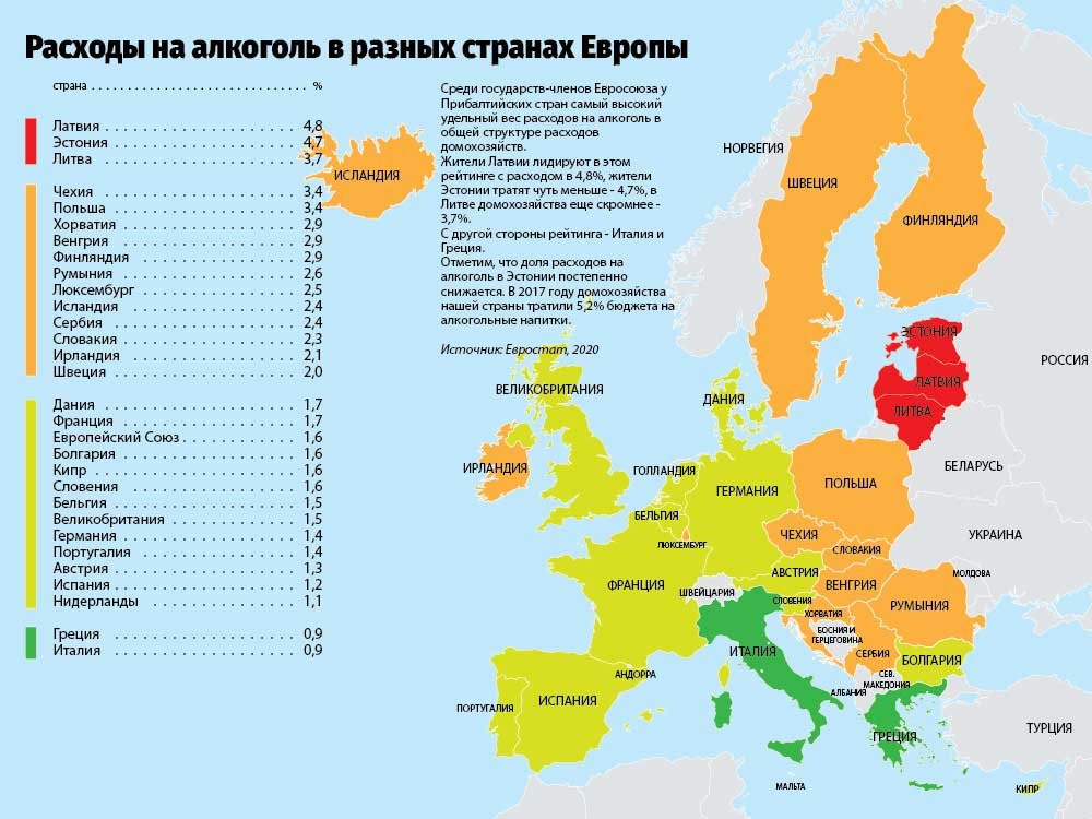 Среди государств-членов Евросоюза у Прибалтийских стран самый высокий удельный вес расходов на алкоголь в общей структуре расходов домохозяйств.