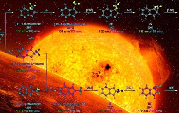 Ученые провели эксперимент, смоделировав условия околозведной среды, в которой происходит химическое взаимодействие двух углеводородных радикалов (метил (CH3•) и 1-инденил (C9H7•). В следствии реакции, протекающей при температуре 1150 градусов Цельсия, образовался нафталин с химической формулой С10Н8, содержащий два бензольных кольца. Такие данные подтвердил анализ масс-спектрометра.