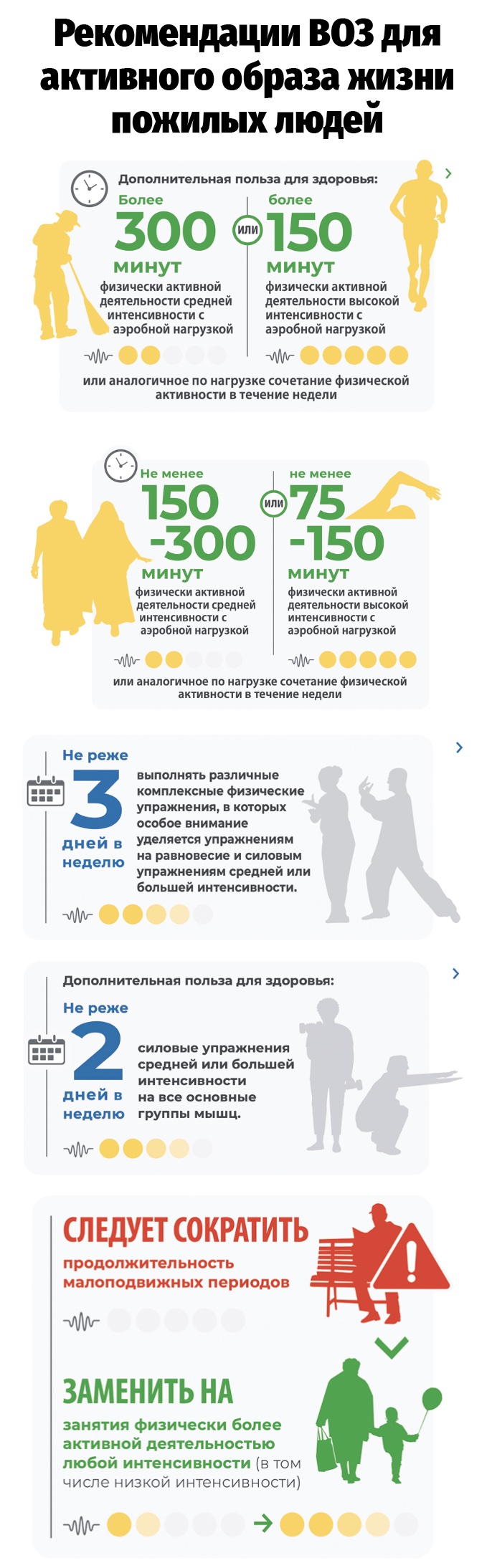 Всемирная организация здравоохранения (ВОЗ) настоятельно рекомендует людям в возрасте не сидеть на месте. Как считают специалисты, физическая активность пожилых людей благоприятно отражается на основных показателях, связанных со здоровьем: снижает степень ожирения и смертность от всех причин, в том числе – от сердечно-сосудистых заболеваний, заболеваемость гипертонией, раком отдельных локализаций, диабетом 2-го типа; улучшает психическое (например, уходят симптомы тревоги и депрессии) и когнитивное здоровье (профилактика деменции!), а также сон.